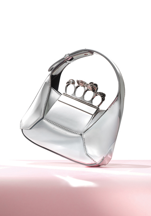 브랜드의 아이코닉한 너클이 돋보이는 주얼 호보 미니 백의 새로운 컬러, 실버. 너클에 장식한 커다란 패싯 스톤에서 영감받아 만든 주얼 호보 보디 실루엣이 인상적이다. 몇 개의 재단을 조립해 새로운 호보 형태를 만들었으며, 특유의 날렵하고 유려한 라인을 자랑한다. 3백29만원 알렉산더 맥퀸. 문의 02-6105-2226