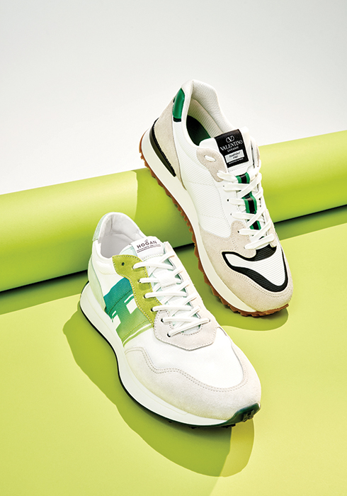 (위) 스웨이드와 네오프렌 소재를 믹스한 컬러 블록으로 심플하면서도 캐주얼하고 개성 있는 디자인을 선보이는 V 로고 페이스 스니커즈 1백23만원 발렌티노 가라바니 02-2015-4655. (아래) 대담한 룩과 쿨한 스타일에 레트로한 분위기가 어우러진 디자인으로 가벼운 아웃솔에 메모리폼 인솔을 갖춰 편안한 착용감을 선사하는 H601 스니커즈 74만5천원 호간 02-3479-1593. |