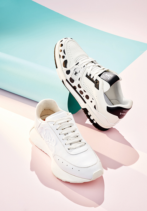 (위) 일본 아티스트 쿠사마 야요이와 컬래버레이션한 컬렉션의 제품으로 화이트 송아지가죽에 그녀만의 시그너처인 도트를 블랙으로 장식한 개성 있는 스타일의 LV x YK 트레이너 스니커즈 1백76만원 루이 비통 02-3432-1854. (아래) 화이트 메탈 프리 가죽 소재로 피스 및 패치 장식의 어퍼 실루엣이 특징이며, 유연하고 가벼운 러너 밑창과 라지 사이즈 플랫 레이스, 패딩 처리한 힐 카운터와 텅 등 디테일이 살아 있는 스프린트 러너 90만원대 알렉산더 맥퀸 02-6105-2226. |