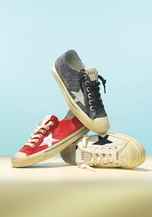 골든구스의 아이코닉한 스니커즈 중 하나로 특유의 빈티지한 컬러와 텍스처 조합이 돋보이며, 성별에 상관없이 매치할 수 있는 클래식한 디자인이 특징이다. 특유의 디스트레스드 디테일이 돋보이는 블랙 브이스타 스니커즈, 화이트 캔버스 소재에 블랙 스웨이드 스타 로고로 장식한 브이스타 스니커즈, 스웨이드 소재의 다크 레드 컬러로 룩에 포인트가 되어줄 브이스타 스니커즈 모두 71만8천원 골든구스. 문의 02-519-2938