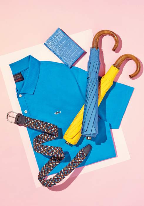 (왼쪽 아래부터 시계방향으로) 탄탄한 가죽 트림으로 개성 있는 패턴 디자인과 훌륭한 내구성을 갖춘 스마트 캐주얼 벨트 17만8천원 앤더슨스 by 폼라운지 02-3438-6142. 청량한 코발트 블루 컬러로 시선을 사로잡는 시그너처 샤크 뱃지 피케 볼로 셔츠 19만9천원 폴앤샤크 02-3438-6287. 앨리게이터 가죽 느낌의 표지로 간단한 메모도 특별하게 담아줄 고급스러운 노트 18만8천원 스마이슨 by 폼라운지, 비비드한 컬러감이 일품이며 메이플 핸들로 견고함까지 갖춘 우산 27만8천원 폭스 엄브렐라 by 폼라운지 02-3438-6142. |