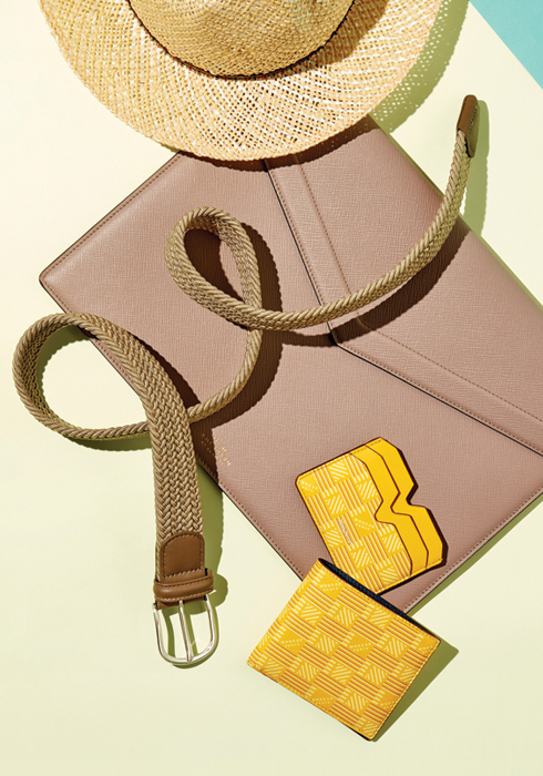 (위부터 차례대로) 가벼운 스트로 짜임에 클래식한 디자인으로 데일리로 착용하기 좋은 모자 36만8천원 카시라 by 폼라운지, 심플하고 모던한 디자인에 가죽 소재로 고급스러운 연출이 가능한 엔벨로프 디자인의 노트북 케이스 85만8천원 스마이슨 by 폼라운지, 가죽 트림으로 개성 있는 디자인과 내구성을 겸비한 스마트 캐주얼 벨트 17만8천원 앤더슨스 by 폼라운지, 넉넉한 카드 수납력을 자랑하는 콤팩트한 사이즈의 카드 홀더 39만8천원, 비비드한 옐로 톤에 은은한 패턴이 돋보이는 실용성 높은 반지갑 59만8천원 모두 모로 by 폼라운지 02-3438-6142. |