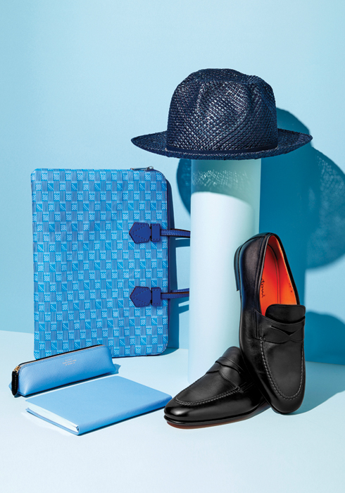(오른쪽 위부터 시계 방향으로) 가벼운 스트로 짜임에 시원한 블루 컬러로 여름에 햇빛을 가려줄 모자 36만8천원 카시라 by 폼라운지, 고급스러운 가죽과 오렌지 컬러 내피로 은은한 멋을 자랑하며 부드럽고 편안한 착용감을 선사하는 로퍼 1백18만원 산토니 by 폼라운지, 송아지가죽 소재의 커버와 컬러감이 돋보이는 고급스러운 느낌의 노트 39만8천원, 부드러운 송아지가죽으로 여닫기 편하며 스카이 블루 컬러가 포인트를 더해주는 필통 43만8천원 모두 스마이슨 by 폼라운지, 비비드한 컬러감에 헤리티지 모노그램을 적용해 유쾌한 감성을 부여하는 브리프케이스 1백72만원 모로 by 폼라운지 02-3438-6142. |
