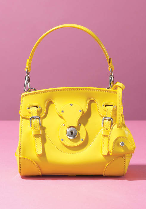 페이턴트 가죽 소재의 진한 옐로 컬러 미니 리키 백. 지갑과 파우치 정도만 들어가는 아주 작은 사이즈다. 19Ⅹ15.5cm, 1백66만원 랄프 로렌.