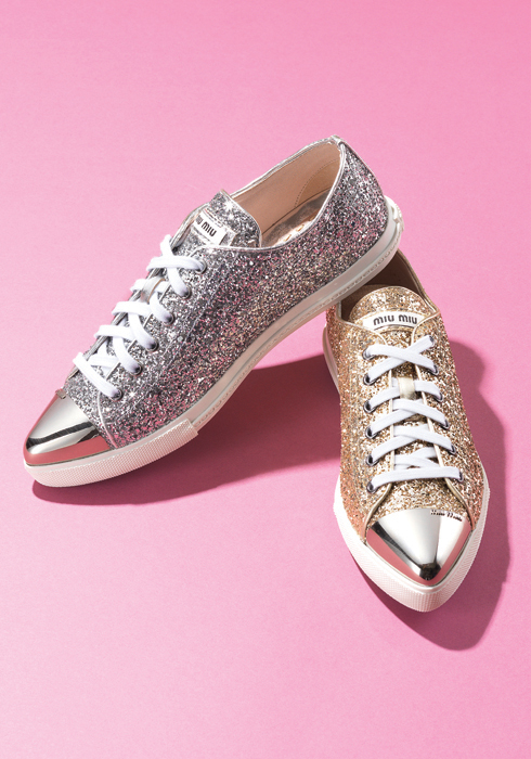 앞코에 스틸로 포인트를 준 스니커즈. 반짝이를 뿌린 듯한 디자인 외에 솔리드 컬러로도 선보인다. 60만원 미우미우.