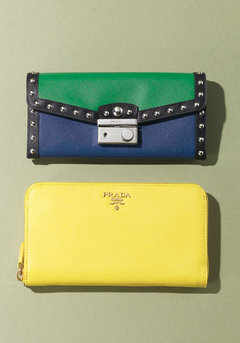 볼드한 메탈 장식 장지갑과 옐로 사피아노 장지갑. 스크래치와 오염에 강한 빗살무늬 소가죽으로 만들었다. 각 70만원대 모두 프라다.
