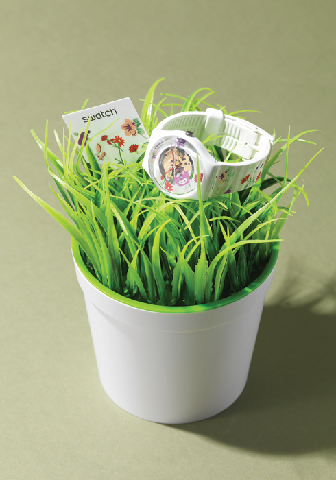 플라워 프린트 다이얼과 스트랩이 경쾌한 워치. 잔디 화분 케이스로 재미를 더했다. 9만6천원 스와치.