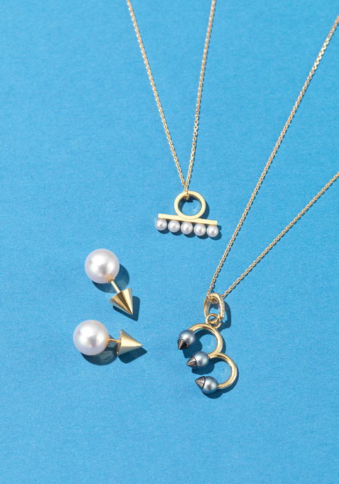 진주 리버시블 이어링 1백40만원대, 밸런스 참 네크리스 펜던트 50만원대, 체인 20만원대, 블루 진주 리파인드 리벨리온 참 펜던트 70만원대, 롱 체인 40만원대 모두 타사키.