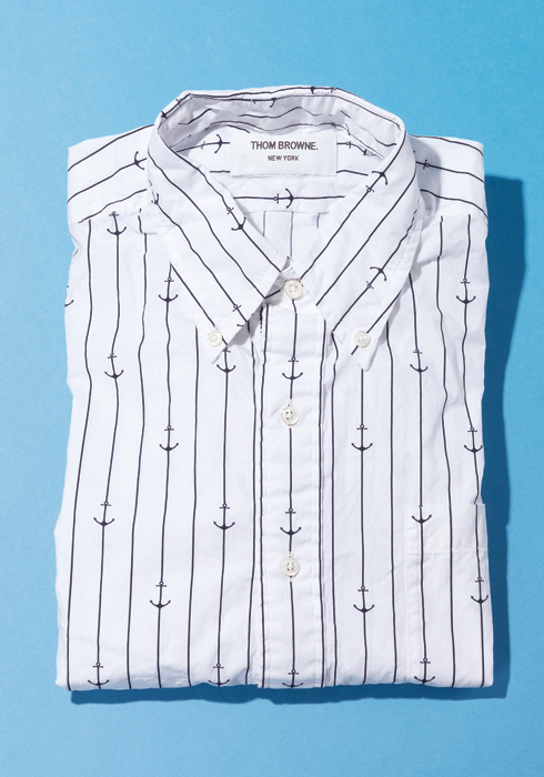 자연스러운 구김이 오히려 더 멋스러운 화이트 셔츠. 앵커 모티브와 스트라이프 패턴이 시원한 느낌을 준다. 45만원 톰 브라운.