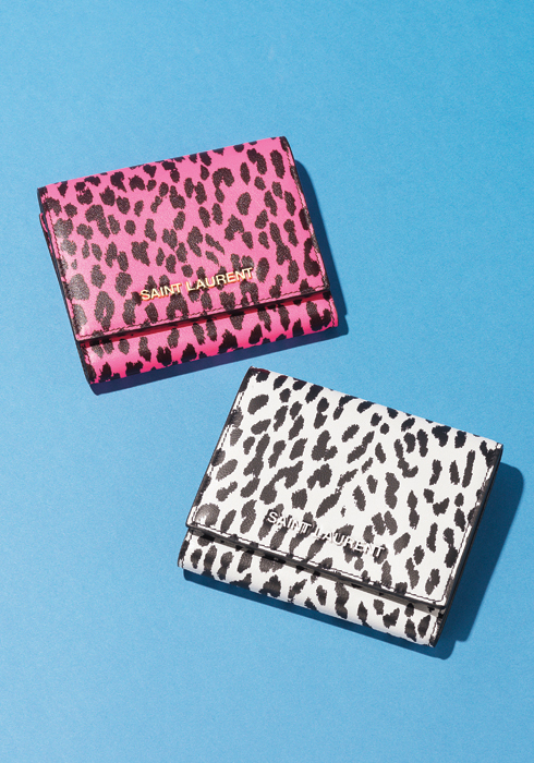핑크와 화이트 바탕의 블랙 프린트가 서로 다른 매력을 풍기는 반지갑.각 50만원대 모두 생로랑.