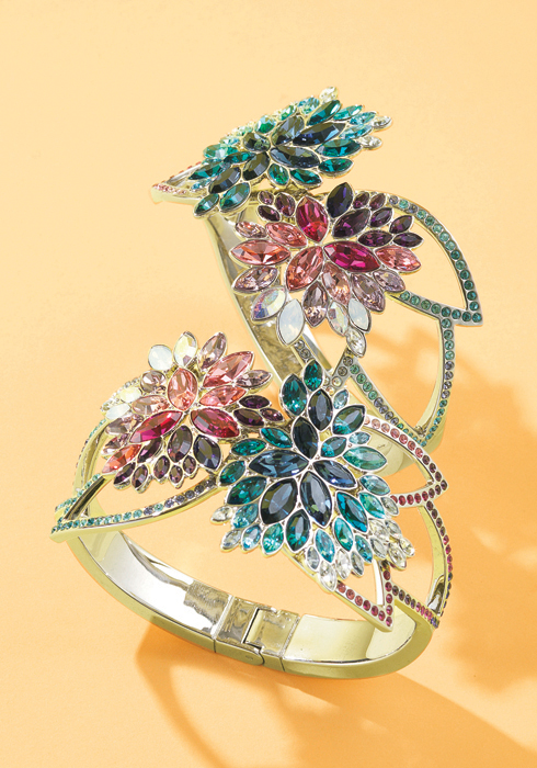 컬러풀한 스톤으로 플라워 모티브를 장식한 아돈 뱅글. 심플한 드레스에 포인트 액세서리로 착용하기에 좋다. 각 46만원 스와로브스키.