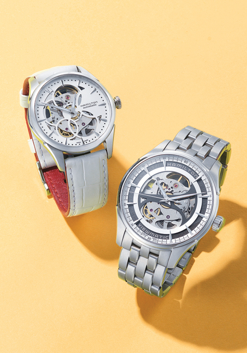 오토매틱 무브먼트의 움직임을 투명한 창으로 확인할 수 있는 커플 워치. 기계식 시계의 즐거움을 만끽할 수 있는 모델이다. 여성을 위한 화이트 밴드 1백47만원, 남성을 위한 스틸 밴드 1백57만원 모두 해밀턴.