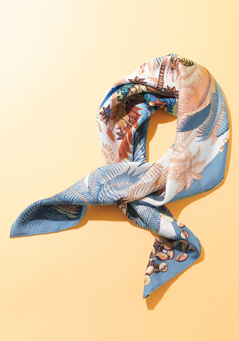 펼치면 한 폭의 그림을 연상시킬 만큼 예술적인 패턴과 컬러를 입힌 실크 스카프. 화이트 셔츠에 매치하면 멋스럽다. 50만원대 에르메스.