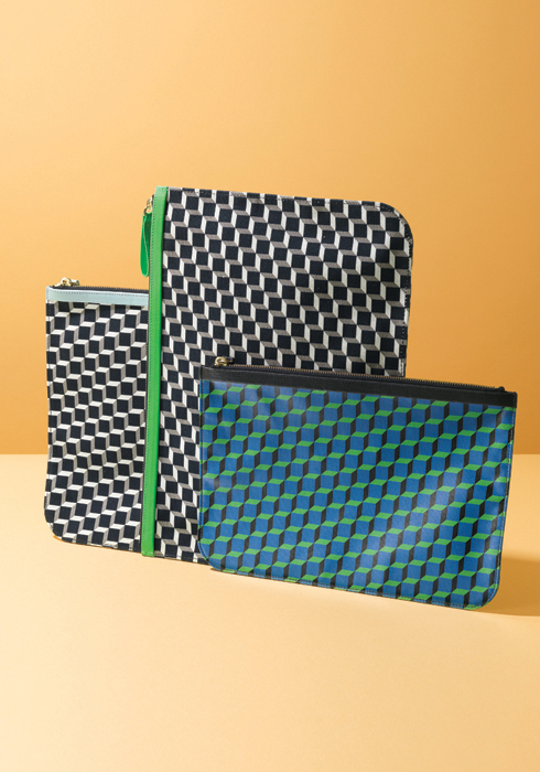 브랜드의 시그너처인 도형 패턴을 전면에 사용한 클러치 L사이즈 36Ⅹ26.5cm, S사이즈 30Ⅹ20.5cm 각 33만원 모두 피에르 아르디.