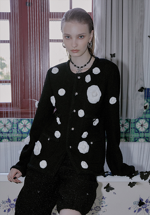 울 트위드 소재의 블랙 & 화이트 컬러 재킷, 이리데슨트 트위드 소재의 블랙 컬러 버뮤다팬츠, 메탈 & 글라스 펄 소재의 블랙 컬러 초커, 메탈 & 스트라스 소재의 이어링 모두 가격 미정 샤넬.