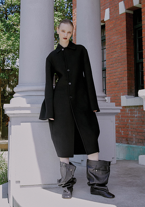 울 소재의 블랙 컬러 벌룬 코트 5백50만원, 램 스킨 소재의 블랙 컬러 토이 판타 하이 부츠 4백50만원 모두 로에베.