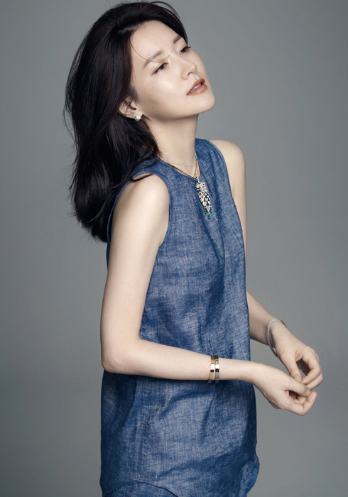 그린 에메랄드를 세팅한 팬더 드 까르띠에 하이 주얼리 네크리스, 팬더 드 까르띠에 컬렉션 이어링, 브레이슬릿, 오른쪽 손목에 착용한 화이트 골드와 핑크 골드의 러브 브레이슬릿 모두 까르띠에. 데님 질감의 리넨 슬리브리스 톱과 팬츠 모두 띠어리. 블랙 다이얼이 유니크한 프로므나드 뒨 팬더 워치, 오른쪽 손목에 착용한 못 모티브의 저스트 앵 끌루 브레이슬릿, 팬더 드 까르띠에 컬렉션 옐로 골드 이어링과 링 모두 까르띠에. 서머 코튼 니트 풀오버 띠어리. 화이트 진 팬츠 레그&본 by 비이커.