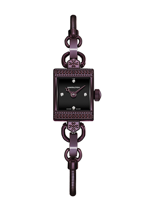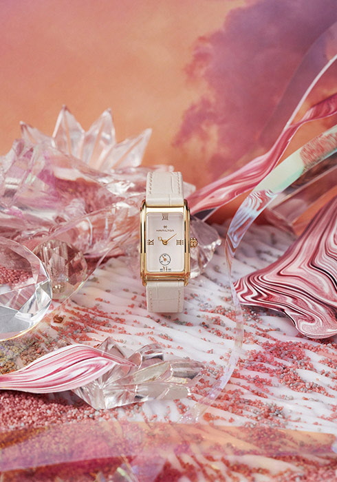 제니 브라이언트는 스포티한 매력의 ‘인트라-매틱 오토매틱 크로노그래프 워치’에 따뜻하고 섬세한 컬러와 부드러운 텍스처를 더했다. 여기에 다이아몬드 디테일과 라이트 옐로 골드 PVD, 파우더리한 느낌의 로즈 컬러 가죽 스트랩으로 화려한 할리우드 분위기를 표현했다. 1968년의 크로노그래프 워치에서 영감받아 탄생한 타임피스가 21세기 도시 혹은 트랙에 어울릴 법한 자유롭고 활동적인 스타일로 변신한 것이다. 그녀의 손길이 닿아 새롭게 탄생한 두 번째 시계는 ‘아드모어 쿼츠 워치’. 기존의 다채로운 아르 데코 스타일에 뉴트럴 컬러와 매혹적인 텍스처를 더해 한층 모던하고 고급스럽게 변신했다. 중앙에 자리 잡은 실버-화이트 오팔린 다이얼은 라이트 옐로 골드 컬러 케이스와 완벽한 조화를 이루며, 오프화이트 컬러의 이미테이션 앨리게이터 가죽 스트랩은 여성스러움을 더해준다. 마지막 주인공은 선레이 브러싱 처리한 블랙 다이얼과 그 위에 자리 잡은 눈부신 다이아몬드가 특징인 ‘빈티지 레이디 쿼츠 워치’로 짙은 플럼 컬러 케이스가 독특한 개성을 드러낸다. 20세기 초 출시한 해밀턴 펜던트 워치에서 영감받은 1950년대 오리지널 디자인에 독특한 포인트를 더한 것이 특징이다.
