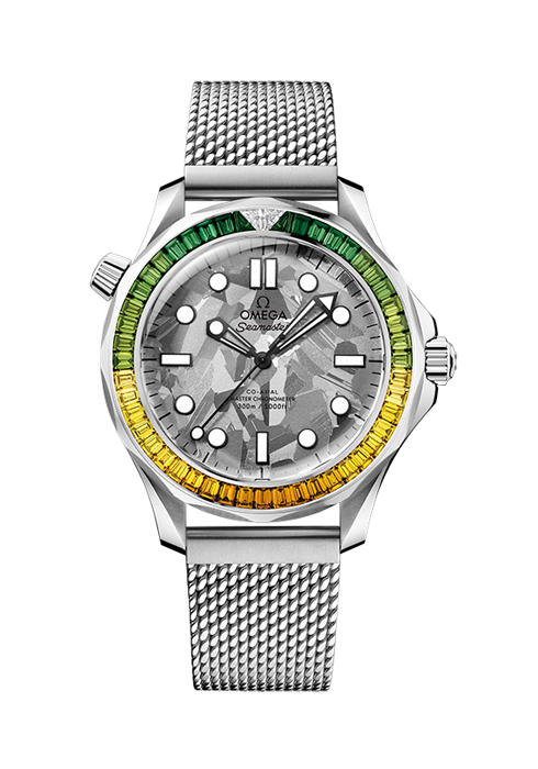3 제임스 본드 탄생 60주년을 기념하는 또 하나의 특별한 타임피스. 오랜 기간 눈부신 광채를 유지한다고 알려진 오메가의 18K 캐노푸스 골드™(Canopus Gold™)로 제작했다. 자메이카 국기를 연상시키는 베젤에는 엑스트라 다크 포레스트 그린에서 올리브, 옐로, 골드, 골드/코냑을 거쳐 코냑까지 10가지 트로피컬 컬러를 띤 그린 및 옐로 천연 다이아몬드를 파베 세팅했다.