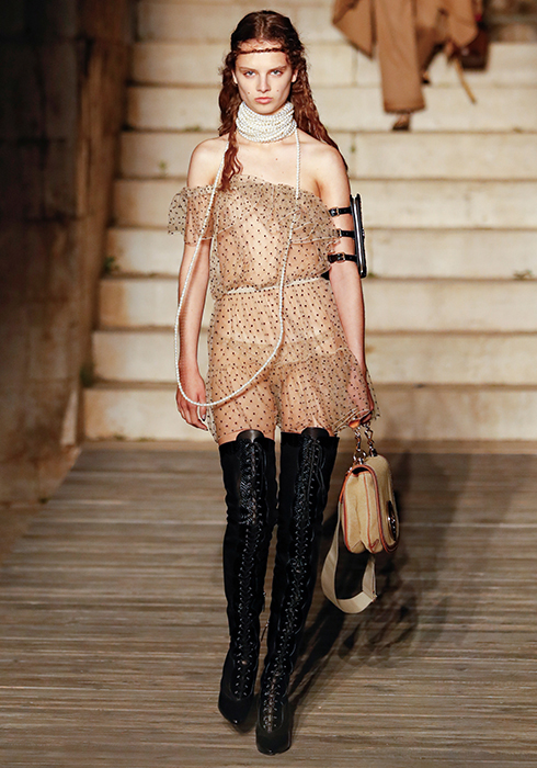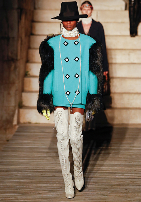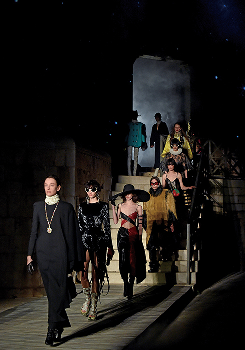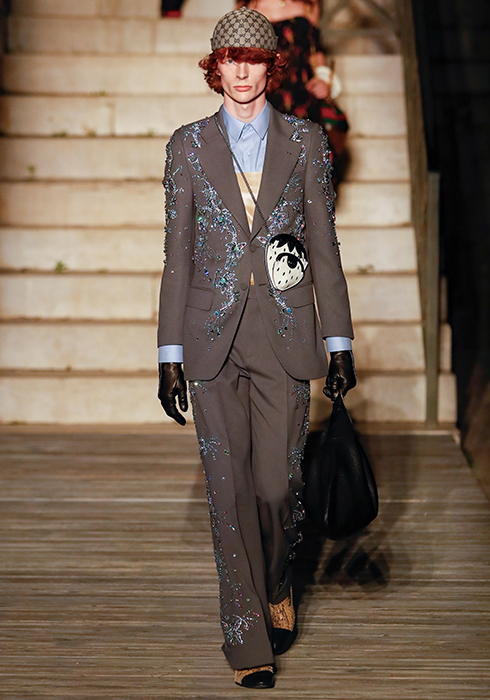 별자리는 베냐민으로 인해 철학적 개념으로 재탄생했다. 하늘의 별들처럼 언뜻 보기에는 흩어져 각자 고립된 듯 보일 수 있는 것들이 베냐민이라는 철학자의 눈을 통해 연관성을 지닌 집합체로 변화한다. 별자리는 과거와 현재, 시간과 공간, 그리고 작은 파편을 결합한 뜨겁고 빛나는 또 다른 세상인 것이다. 이 심오하고 초현실적인 사유가 구찌의 2023 크루즈 컬렉션 주제인 코스모고니(cosmogonie)로 태어났다. 미켈레는 언제나 해독하기 어려운 의미가 담긴 프리즘과 같은 컬렉션을 선보이곤 한다. 2023 크루즈 컬렉션 역시 프리즘처럼 환상적이고 몽환적인 분위기로 가득했다. 하지만 그가 보여주고 싶어 했던 우주론과 별자리의 이론처럼 과거와 현재를 연결하는 디테일로 장식된 의상은 결코 허황되지만은 않다. 우아한 귀족풍의 숙녀, 십자군을 연상시키는 기사, 중세 초상화에서 본 듯한 소녀, 낭만적인 시대물의 여주인공, 1960~70년대 복고풍의 학생, 사이키델릭한 전사…. 시대와 상상을 뛰어넘는 의외의 스타일링과 파격적인 디자인의 소품 등은 충분히 아름답고 드라마틱했다. 미켈레에 의해 창조된 구찌의 패션 연금술은 관객들을 잠시 별이 빛나는 우주로 이끌었다. 견고한 요새처럼 보이는 성벽에 비친 파편 같은 별자리들, 자연 그대로의 현상으로 하늘에 떠오른 붉은 보름달, 끊임없이 이어지는 매력적인 모델들의 향연. 그 자리에 참석한 모든 이들에겐 마법과 같은 밤이었다. 하지만 애석하게도 독창적이고도 복잡했던 알레산드로 미켈레의 컬렉션은 더 이상 구찌에서 볼 수 없을 듯하다. 그래서 더욱 기억에 남는 코스모고니의 밤. 그 아름답고 신비스러웠던 여정은 오래도록 기억에 남을 것이다.