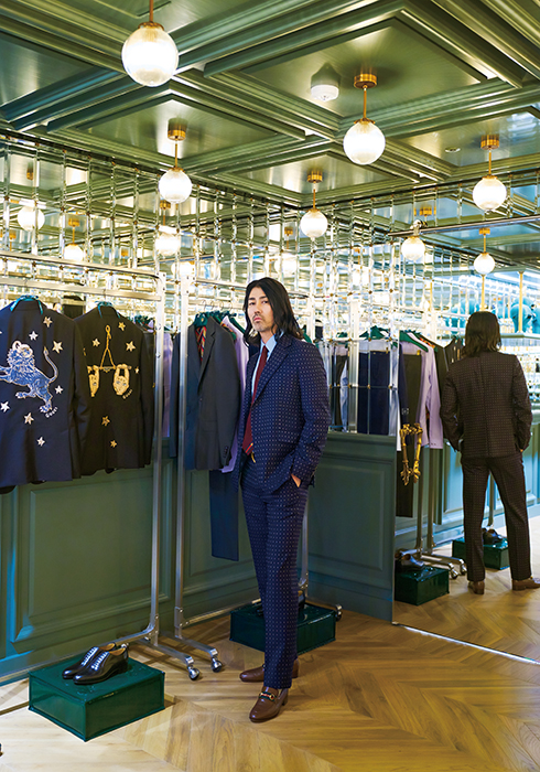 G 패턴이 돋보이는 테일러링 재킷과 팬츠를 모카신과 매치한 차승원. |