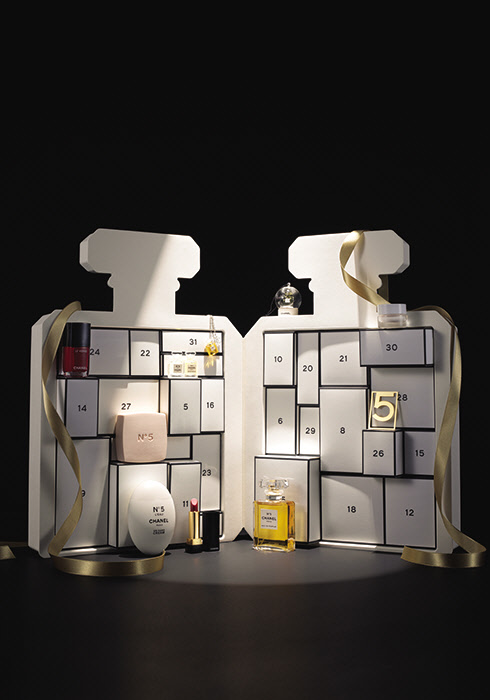 N°5를 상징하는 숫자 5번부터 파리 깡봉가 31번지를 의미하는 31번까지 번호가 새겨진 27개의 박스로 구성한 홀리데이 컬렉션, N°5 캘린더 98만5천원.