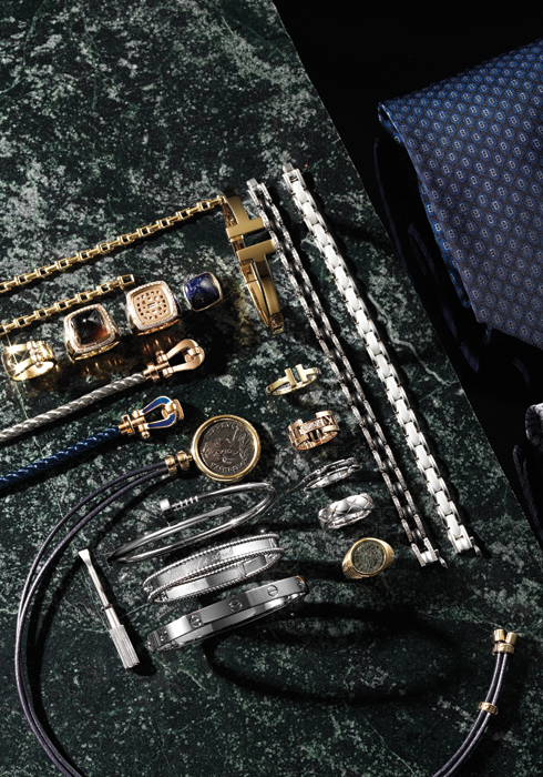 작은 T 모티브가 입체적으로 결합되어 있는 티파니 T 내로우 체인 네크리스 옐로 골드 소재 9백만원대 티파니. 옐로 골드 버클 모티브의 포스텐 라지 링 3백만원대, 브랜드 창립자가 삶의 원동력으로 삼았던 찬란한 빛에서 영감을 받은 디자인으로 대범한 카보숑 컷 스톤을 교체해서 착용할 수 있는 빵 드 쉬크르 인터체인저블 링. 다양한 소재의 카보숑 컷 스톤 중 원하는 컬러를 선택할 수 있다. 스모키 쿼츠, 라피스 라줄리 스톤 링 각1천만원대. 버클과 케이블을 분리해 다양하게 매치할 수 있는 포스텐 브레이슬릿 버클과 케이블 1세트 각 2백만원대. 모두 프레드. 앤티크 코인을 모티브로 빈티지한 주얼리를 완성한 모네떼 컬렉션 네크리스 6백만원대 불가리. 못 모티브에서 영감을 받은 강렬한 디자인의 저스트 앵 끌루 화이트 골드 브레이슬릿 8백만원대 까르띠에. 섬세한 비즈 장식에 세심한 인그레이빙이 매력적인 화이트 골드 뻬를리 브레이슬릿 8백만원대 반클리프 아펠. 남성과 여성을 막론하고 전 세계적으로 오래도록 사랑받아온 러브 브레이슬릿. 왼쪽에 놓인 전용 드라이버로 오픈할 수 있다. 8백만원대 까르띠에.