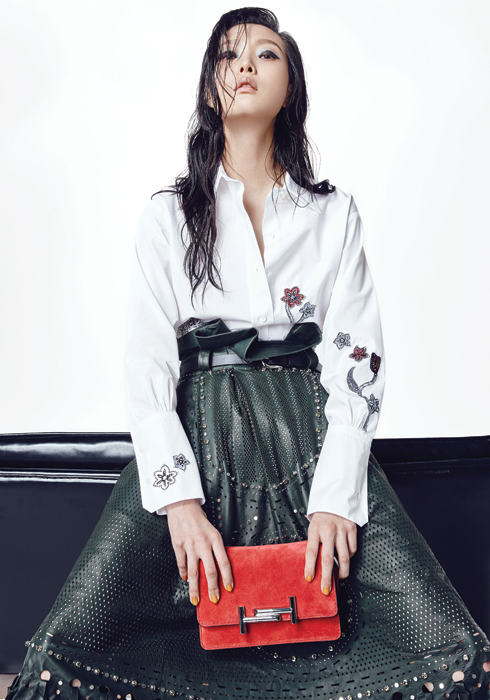 플라워 자수를 더한 화이트 셔츠, 양가죽 소재의 레이저 펀칭 스커트, 블랙 레더 벨트, 스웨이드 소재의 레드 컬러 더블-T 백 모두 토즈.