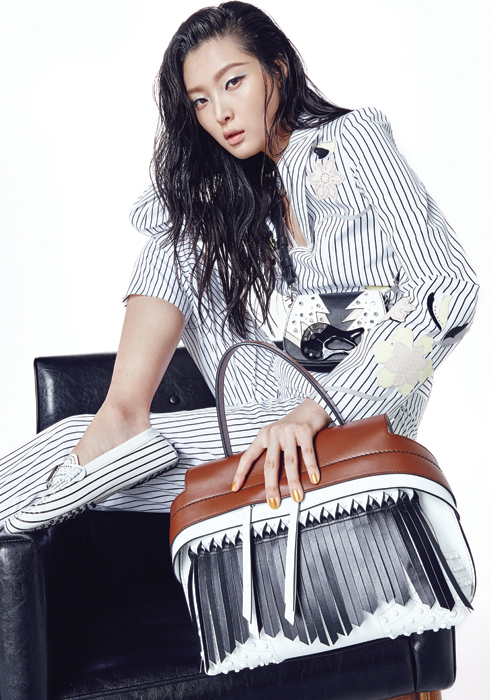 핀스트라이프 재킷과 하이 웨이스트 팬츠, 숄더백으로 연출한 송아지가죽 소재의 더블-T 백, 가죽 프린지 디테일의 웨이브 백, 스트라이프 패턴 고미노 슈즈 모두 토즈.