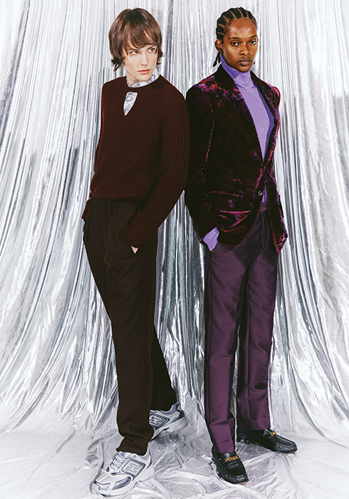 (왼쪽) 울 소재 버건디 컬러 니트 톱 1백만원대, 실크 소재 패턴 셔츠 1백만원대, 울 소재의 버건디 컬러 팬츠 1백만원대, 카프 레더 소재 실버 컬러 로고 스니커즈 1백만원대 모두 펜디. |
