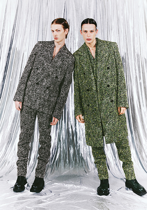 (왼쪽) 블랙 컬러 헤링본 패턴 재킷 가격 미정, 블랙 컬러 헤링본 패턴 팬츠 가격 미정, 블랙 컬러 러그 레이스업 부츠 2백만5천원 모두 보테가 베네타. (오른쪽) 그린 컬러 헤링본 패턴 코트 가격 미정, 그린 컬러 헤링본 패턴 재킷 가격 미정, 그린 컬러 헤링본 패턴 팬츠 가격 미정, 보틀 그린 컬러 러그 레이스업 부츠 2백만5천원 모두 보테가 베네타. |