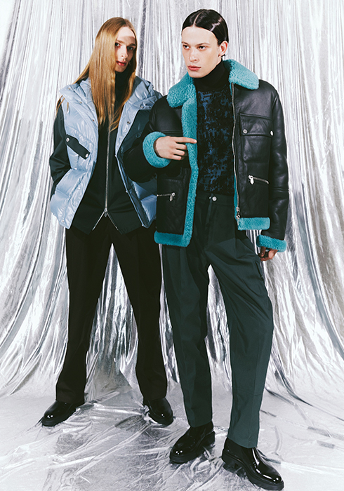 (왼쪽) 회녹색 더블 블루종 패딩 재킷, 저지 소재의 브라운 컬러 팬츠, 카프 스킨 소재의 블랙 컬러 첼시 부츠 모두 가격 미정 에르메스. (오른쪽) 램 스킨 소재의 블랙 & 민트 컬러 시어링 재킷, 브라운 & 블루 컬러 자카드 풀오버 톱, 회녹색 테크니컬 팬츠, 카프 스킨 소재의 블랙 컬러 첼시 부츠 모두 가격 미정 에르메스.