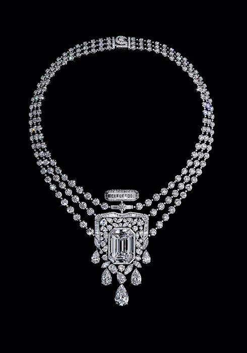 무엇보다 컬렉션의 절정은 향수의 모든 코드를 함축한 55.55 네크리스다. 55.55캐럿의 커스텀 컷 다이아몬드를 통해 N°5의 정체성이 온전히 드러난다. 향수병 마개의 옆모습, 보틀의 실루엣, 숫자 5 형태의 잠금장치, 하나씩 커팅한 다양한 크기의 페어 컷 다이아몬드가 폭포처럼 흘러내리며 폭발하는 잔향을 표현한 디자인은 N°5를 완벽하게 오마주한다. 55.55 네크리스를 통해 샤넬의 완벽주의, 그리고 놀라운 창의성과 기술 수준을 엿볼 수 있다. 관념적이면서 비유적인 55.55 네크리스는 단순한 스타일이 아닌 샤넬 N°5의 정신과 최고의 주얼리 제작 기술의 결합이다. 순수하게 창조 행위로 완성한 예술 작품과도 같은 55.55 네크리스는 샤넬 소장품 컬렉션으로 방돔 광장 18번지에 보존된다. 이는 샤넬 하이 주얼리 역사의 영원한 일부이자 방돔 광장과 N°5 향수를 이어주는 물리적 상징이 될 것이다.