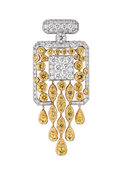 2 흐르는 향수를 라운드 컷과 페어 컷의 옐로, 화이트 다이아몬드로 형상화한 시그너처 보틀 브로치.