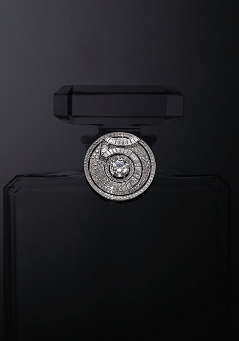 N°5의 특별한 향을 더욱 특별하게 만든 것은 단순하고 엄격한 선으로 이루어진 직사각형 보틀이었다. 1920년대 당시 유행하던 화려한 향수병들과는 확연하게 달랐다. 모던 그 자체였다. 직사각형 병은 화이트와 옐로 다이아몬드, 옐로 사파이어로 표현되었다. 병에서 흘러나온 향수를 페어 컷 다이아몬드와 라운드 컷 다이아몬드로 형상화한 시그너처 보틀(Signature Bottle) 시리즈, 마치 수채화처럼 그러데이션한 컬러로 병이 점점 향수로 변화하는 듯 유기적인 선을 그리는 앱스트렉션(Abstraction) 시리즈가 그것이다. N°5 보틀의 또 다른 특징은 병마개인 스토퍼다. 다이아몬드같이 팔각형으로 커팅한 직사각형의 스토퍼는 위에서 내려다본 파리 방돔 광장을 상기시킨다. 가브리엘 샤넬이 ‘비쥬 드 디아망’ 컬렉션을 발표했을 당시 다분히 폐쇄적이고 남성 중심적인 방돔 광장에 보석계에 패션 디자이너가 발을 들였다는 사실은 매우 도전적인 일이었다. 이를 상징하는 향수병 마개가 ‘컬렉션 N°5’을 통해 보석으로 재해석되었다. 수정을 절묘하게 깎아내고 다이아몬드, 오닉스, 진주, 옐로 사파이어를 세팅한 팔각형 보석은 우아하고 정교하기 그지없다. 그중 토파즈를 다양한 크기로 라운드 모양과 페어 모양으로 커팅한 골든 버스트 링과 다이아몬드 리본으로 사랑스러움을 더한 스토퍼 등은 N°5의 상징을 독보적으로 드러낸다. 가브리엘 샤넬이 유독 사랑했던 숫자 5. N°5의 신비로움에 공헌한 숫자 5는 컬렉션에 현대적인 분위기와 위트를 담당했다. 숫자 5가 중심에서 벗어난 곳에 자리 잡은 초커, ‘콜리어 그래픽 N°5(Collier Graphic N°5)’는 장난치기 좋아하는 샤넬의 유머러스한 면모를 드러낸다. 조형적으로 훌륭한 재료인 숫자 5를 다양한 방식으로 주얼리에 녹인 ‘이터널 N°5(Eternal N°5)’는 샤넬 하이 주얼리의 디자인 능력을 유감없이 보여준다. N°5 향의 중심인 재스민, 메이 로즈, 일랑일랑 같은 꽃은 형형색색의 주얼리로 만개했다. 과감하고 입체적인 플라워 장식에 ‘비쥬 드 디아망’ 컬렉션에서 사용한 별, 달, 태양 모티브가 어우러져 생동감이 넘치고 관능미가 흐른다. 메이 로즈는 마치 달처럼 탐스럽게 핑크 사파이어 잎을 피웠고 소투아르 펄 네크리스와 다이아몬드를 세팅한 체인이 메이 로즈의 줄기가 되었다. 다이아몬드를 이슬처럼 흩뿌린 눈부신 네크리스에 피어난 일랑일랑, 무리 진 다이아몬드의 별 모양으로 피어난 재스민은 진짜 향보다 더 깊고 진한 시각적 향기를 남긴다. N°5는 현대 향수의 시작이었다. 그 결정적 이유는 하나의 꽃에서 추출한 향이 아닌 80여 가지 성분을 부케처럼 혼합해 마치 옷을 구축하듯 구조적인 향을 만들었기 때문이다. 이렇게 겹겹이 쌓은 향은 오묘한 잔향을 남긴다. N°5의 잔향은 다양한 크기와 형태, 다채로운 색의 원석이 되어 목선을 따라 피부에서 향기가 퍼져나가듯 방사형으로 반짝이는 주얼리가 되었다. 다이아몬드, 루비, 가닛, 옐로 사파이어, 핑크와 레드 스피넬이 향이 되어 퍼져나가는 담대한 빛은 강렬한 잔상을 남긴다.