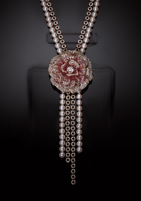 6 N°5의 중심 향인 메이 로즈를 달처럼 탐스럽게 핑크 사파이어와 소투아르 펄로 표현했다.