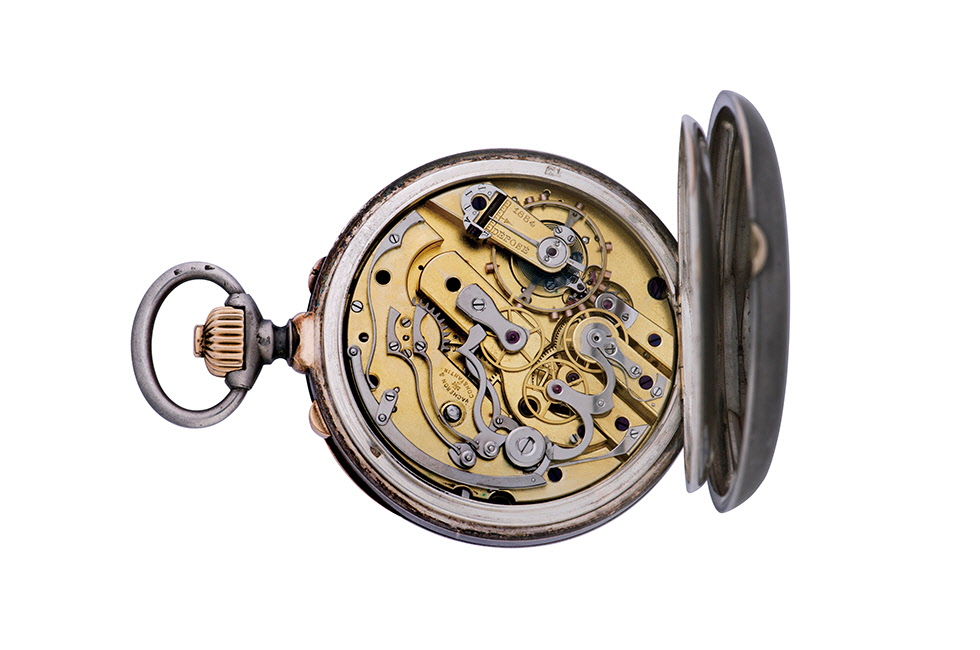 5, 6 기수의 모습을 전면에 새긴 투톤 실버 & 레드 골드 스플릿-세컨즈 크로노그래프 포켓 워치(1889년).
