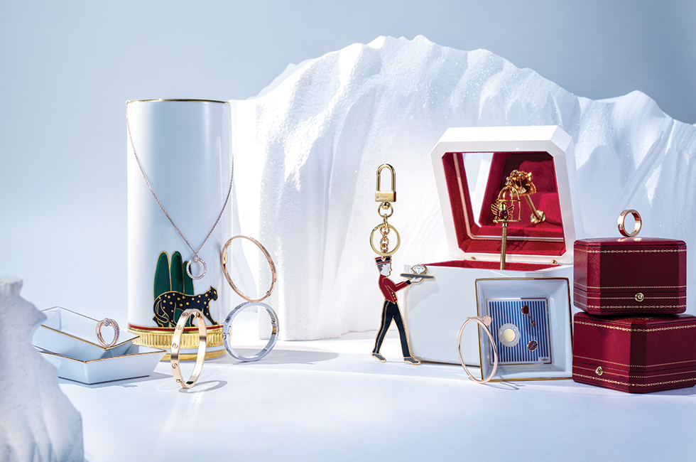 그린·레드·골드 컬러를 담아 색다른 연출을 도와주는 디아볼로 드 까르띠에 트링킷 트레이 3개 세트 50만원대, 공간에 모던하면서 고급스러운 포인트를 줄 팬더 드 까르띠에 화병 미디엄 사이즈 모델 1백만원대, 홀리데이 느낌을 물씬 풍기는 레드 컬러의 제복을 입은 페이지 보이 캐릭터의 래커 골드 피니싱 메탈 소재 디아블로 드 까르띠에 키 링 60만원대, 새장을 반쯤 빠져나온 듯한 새 오브제가 놓여 있어 태엽을 감았다 풀면 ‘라 비앙 로즈’ 음악에 맞춰 회전하는 낭만적인 멜로디 박스 디아블로 드 까르띠에 뮤직 박스 3백만원대 모두 까르띠에. 문의 1877-4326