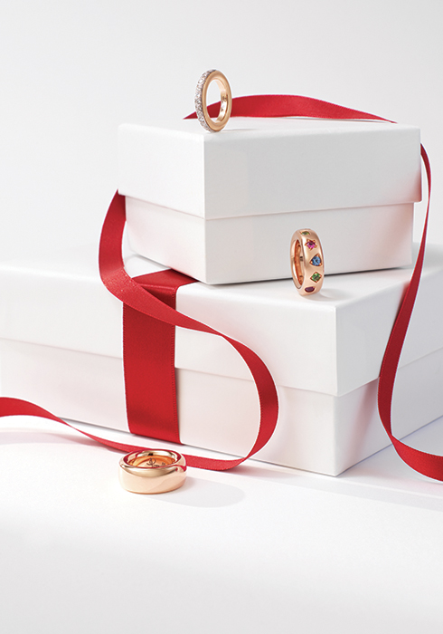 18K 로즈 골드로 이루어진 밴드에 총 1.1캐럿의 38개 다이아몬드를 파베 세팅해 우아함을 더한 이코니카 링, 이코니카 컬렉션 특유의 볼륨감을 잘 표현한 링으로 18K 로즈 골드 소재에 총 1.9캐럿의 오렌지 사파이어와 핑크 트루말린, 페리도트, 루비, 블루 지르콘, 블루 사파이어, 디맨토이드, 레드 스피넬, 탄자나이트, 차보라이트까지, 다양한 스톤으로 화려함을 더한 링, 18K 로즈 골드 소재의 볼륨감 넘치는 디자인으로 룩에 포인트가 되어줄 이코니카 링 모두 가격 미정 포멜라토. 문의 02-3143-9486