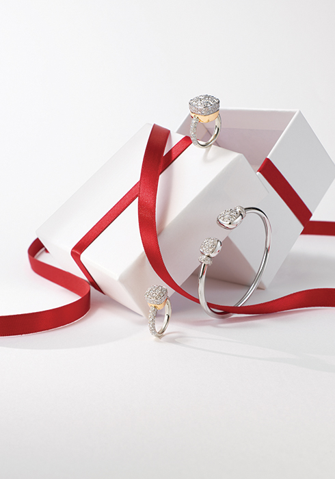브랜드 대표 컬렉션인 누도의 시그너처 디자인을 다이아몬드로 재해석한 주얼리로 18K 로즈 골드와 화이트 골드에 총 3.8캐럿의 1백37개 다이아몬드를 파베 세팅해 볼륨감과 우아함을 더한 대표 링, 18K 로듐 플레이트 화이트 골드 밴드에 총 1.3캐럿의 64개 다이아몬드와 4.1캐럿과 6.5캐럿의 화이트 토파즈 2개로 반짝임을 극대화한 누도 브레이슬릿, 18K 화이트 골드와 로즈 골드 소재에 총 1.8캐럿의 1백5개 다이아몬드를 세팅한 누도 다이아몬드 링 모두 가격 미정 포멜라토. 문의 02-3143-9486