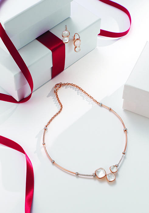 18K 로즈 골드에 총 22.7캐럿의 화이트 토파즈 2개와 머더오브펄 2개, 총 14캐럿의 화이트 토파즈 2개와 머더오브펄 2개로 완성했으며, 착용하는 부분에까지 총 0.2캐럿의 18개 다이아몬드를 파베 세팅해 우아함을 더한 드롭 스타일 이어링, 18K 로즈 골드 소재에 총 36.3캐럿의 화이트 토파즈 3개와 머더오브펄 3개를 비대칭으로 배치해 물방울이 흐르는 듯한 느낌을 연출하고 총 1.9캐럿의 2백19개 다이아몬드로 마무리해 볼륨감을 더한 리비에르 네크리스 모두 가격 미정 포멜라토. 문의 02-3143-9486