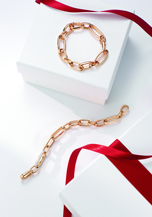밀라노 특유의 절제된 우아함을 보여주는 이코니카 컬렉션의 브레이슬릿으로 18K 로즈 골드 소재로 이뤄진 엑스트라 슬림 브레이슬릿, 18K 로즈 골드 소재의 체인에 총 1캐럿의 80개 다이아몬드를 파베 세팅해 포인트를 더한 엑스트라 슬림 with 다이아몬드 브레이슬릿 모두 가격 미정 포멜라토. 문의 02-3143-9486