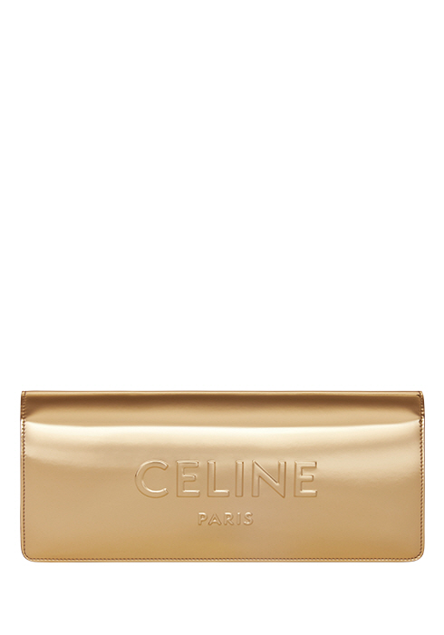 블링블링한 골드빛의 램 스킨 소재 스냅 버튼으로 편하게 오픈과 클로징이 가능해 실용적인 라미네이트 텍스타일 골드 클러치 가격 미정 셀린느. 02-549-6631