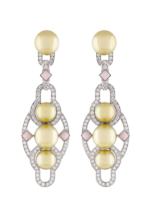 각종 스톤을 주얼리로 제작하는 특별한 노하우를 적용한 피에르 드 케렉테르 컬렉션의 보라보라 이어링. 골드 컬처드 펄을 중심으로 다이아몬드와 핑크 오팔로 장식했다. 가격 미정 반클리프 아펠. 1877-4128