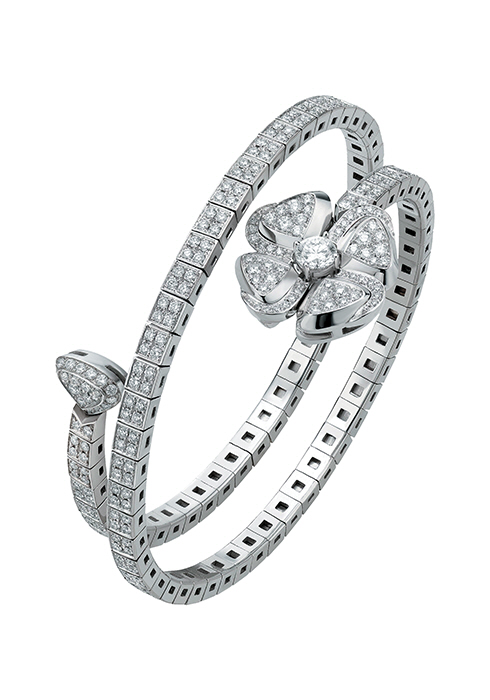 이탈리아어로 꽃을 의미하는 피오레와 영원을 의미하는 포에버를 결합해 완성한 피오레버 컬렉션의 브레이슬릿으로, 화이트 골드 소재에 중앙의 다이아몬드 1개와 주변에 파베 세팅한 다이아몬드까지 총 3.04캐럿으로 장식해 강렬함을 준다. 6천30만원 불가리. 02-2056-0170