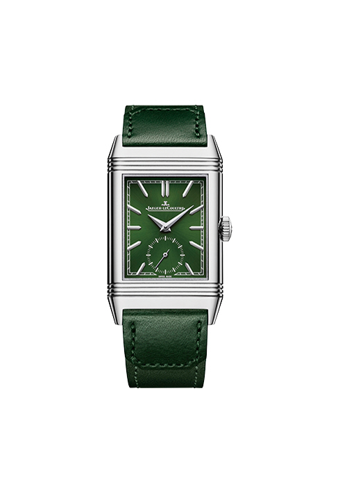 다이얼과 스트랩의 짙은 그린 컬러가 감각적이다. 세로 45.6mm, 가로 27.4mm의 직사각형 스틸 케이스가 심플한 멋을 더하는 리베르소 트리뷰트 스몰 세컨즈 1천1백80만원 예거 르쿨트르. 1877-4201