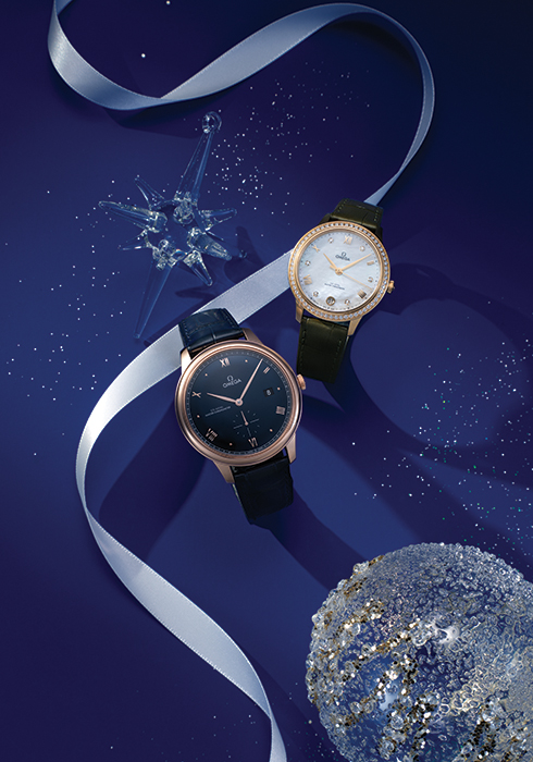 태양광 패턴 마감 처리한 돔형 PVD 다크 블루 다이얼이 특징인 18K 세드나™ 골드 소재의 워치. PVD 처리한 세드나™ 골드 컬러 핸즈와 교차 배열된 로마숫자, 카보숑 인덱스의 깔끔한 디스플레이가 돋보인다. 또 3시 방향의 날짜창, 6시 방향의 스몰 세컨즈 서브 다이얼, 외부 존에 장식된 레일웨이 디자인으로 기본적인 실용성에 충실했다. 드 빌 프레스티지 코-액시얼 마스터 크로노미터 스몰 세컨즈 41MM 1천6백70만원. 18K 옐로 골드 소재의 이 워치는 다이아몬드를 파베 세팅한 베젤과 화이트 자개 다이얼이 조화를 이뤄 손목에 화사함을 부여한다. 옐로 골드 도금 핸즈와 교차 배열된 로마숫자, 다이아몬드 마커의 디스플레이를 갖췄다. 또 6시 방향의 날짜창과 외부 존에 장식된 도트 모양 미닛 트랙의 디자인에서 기품이 느껴진다. 드 빌 프레스티지 코-액시얼 마스터 크로노미터 34MM 2천6백80만원. 모두 오메가. 문의 02-6905-3301