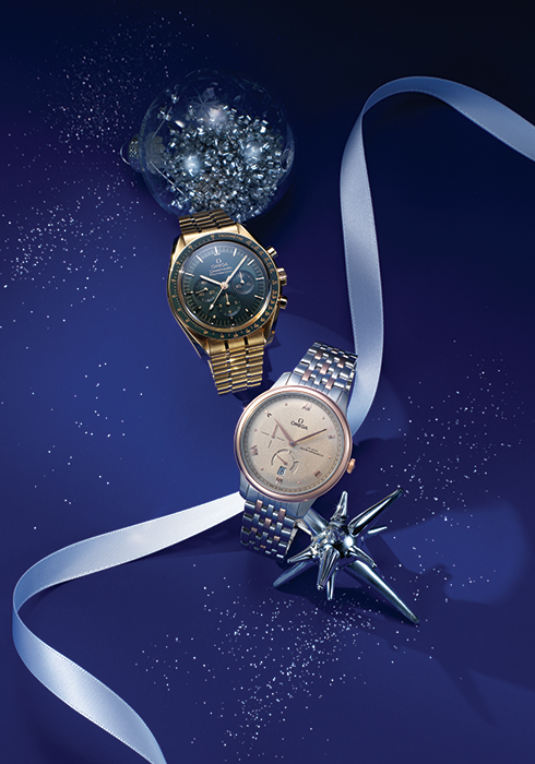 4세대 스피드마스터에서 영감받은 문워치. 18K 문샤인™ 골드 소재의 케이스와 브레이슬릿으로 제작했으며, 태양광 패턴의 그린 PVD ‘스텝’ 다이얼과 ‘문워치’ 스타일 핸즈를 갖췄다. 아이코닉한 DON(90위 도트 장식)이 포함된 세라 골드 타키미터 스케일의 그린 세라믹 베젤 링이 눈길을 끈다. 스피드마스터 문워치 프로페셔널 코‑액시얼 마스터 크로노미터 크로노그래프 42MM 5천1백90만원. 스테인리스 스틸과 18K 세드나™ 골드 소재로 현대적인 이미지를 그려낸다. 6시 방향엔 270도 파워 리저브 인디케이터가 위치하며, 초승달 모양의 4개 섹터와 절제된 대조 효과를 이끌어내는 마감 기법이 적용된 동일한 컬러의 언더 플레이트가 특징이다. 드 빌 프레스티지 코-액시얼 마스터 크로노미터 파워 리저브 41MM 1천2백90만원. 모두 오메가. 문의 02-6905-3301