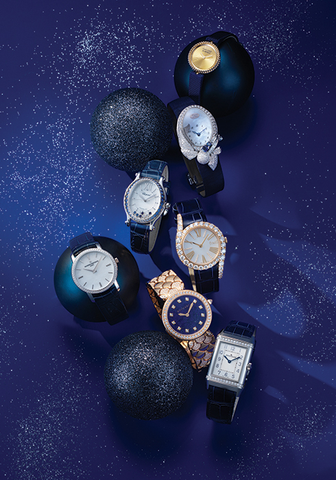 섬세한 골드 비즈의 아름다움이 돋보이는 뻬를리 컬렉션. 18K 옐로 골드 23mm 케이스와 베젤을 장착했으며 18K 옐로 골드 기요셰 다이얼이 기품을 더한다. 뻬를리 워치 1천3백만원대 반클리프 아펠 1877-4128.베젤과 케이스 밴드에만 약 2.848캐럿의 1백46개 브릴리언트 컷 다이아몬드를 세팅해 눈부시게 빛나는 주얼리 워치. 플랜지, 프로스팅 또한 다이아몬드로 장식하고 약 0.59캐럿의 쿠션 컷 사파이어로 프릴을 세팅해 화려함을 더한 볼랑 드 레인 1억6천8백13만원 브레게 02-3479-1008.