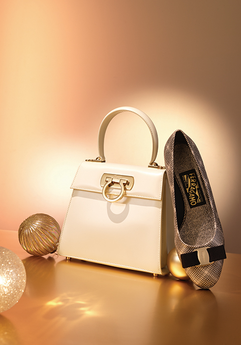 두꺼운 웨지 스타일의 힐로 글램하고 청키한 느낌을 주며 반짝임이 있는 골드 컬러로 마감 처리해 홀리데이 무드를 물씬 느끼게 해줄 소냐 샌들. 발목의 간치니 버클 스트랩으로 편안한 착용감을 선사한다. 1백49만원. 브랜드의 고전적인 아름다움과 장인 정신이 특징인 아이코닉 톱 핸들 백으로 고급스러운 카프 레더 소재, 변함없는 디자인과 컬러감이 럭셔리한 클래식함을 표현한다. 3백29만원. 모두 페라가모. 문의 02-3430-7854